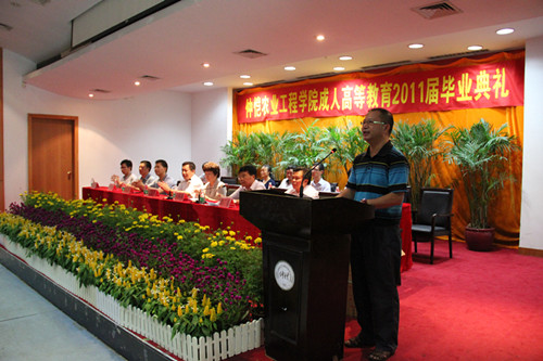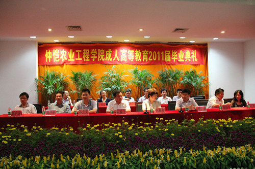 仲愷農(nóng)業(yè)工程學(xué)院成人教育2011屆畢業(yè)生畢業(yè)典禮儀式于2011年7月17日上午10:30在仲愷農(nóng)業(yè)工程學(xué)院學(xué)術(shù)報告廳隆重舉行,仲愷農(nóng)業(yè)工程學(xué)院校、院、系的領(lǐng)導(dǎo)、石龍教學(xué)點、電子計算中心教學(xué)點、萬頃沙教學(xué)點、河源教學(xué)點、江門教學(xué)點的領(lǐng)導(dǎo)以及09屆全體畢業(yè)生300余人出席了此次典禮儀式,包括由東莞函授站東莞電子計算中心副主任劉小龍帶隊的67位09級畢業(yè)生。儀式由仲愷農(nóng)業(yè)工程學(xué)院繼續(xù)教育學(xué)院副院長何斌成主持。